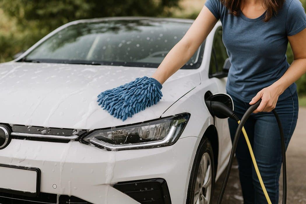 Auch die Außenpflege deines Elektroautos sollte nicht vernachlässigt werden: